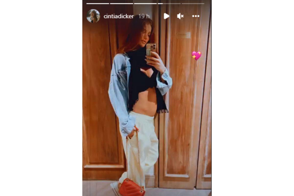 A fotografia foi tirada em frente a um espelho de corpo inteiro e publicado nos stories de seu perfil do Instagram. Na imagem, Cintia aparece usando um top preto, um cachecol da mesma cor, jaqueta jeans e calça de tecido branca. É possível ver que a barriga de grávida está crescendo.