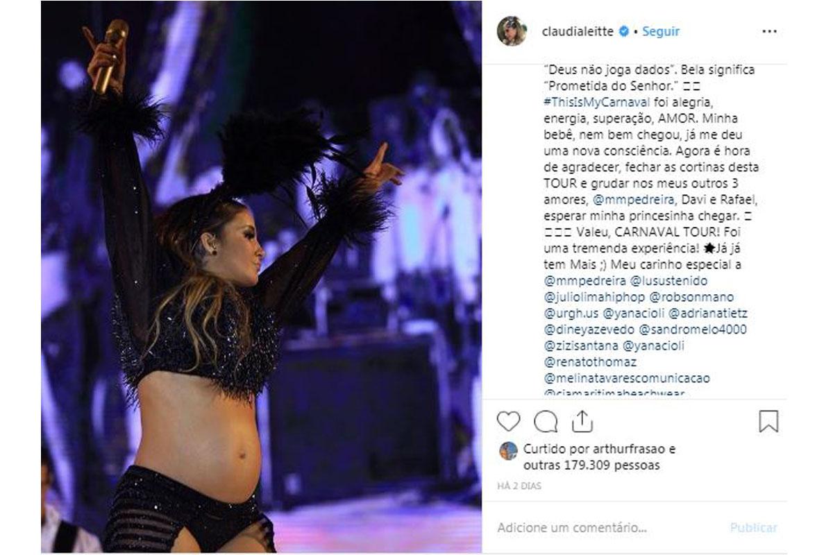Ela falou sobre carreira, sobre a turnê, sobre família e relembrou o aborto que sofreu no meio do ano passado. Depois, Claudinha falou que as coisas vão ficar mais calma. “Agora é hora de agradecer, fechar as cortinas desta tour e grudar nos meus outros 3 amores, @mmpedreira, Davi e Rafael, esperar minha princesinha chegar”, escreveu.