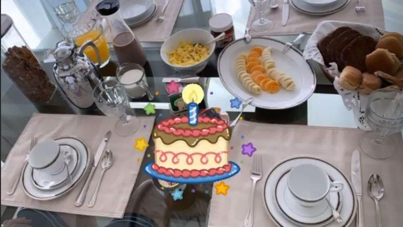 Acompanhada do marido, o empresário Márcio Pedreira, e dos filhos Davi e Rafael, Claudinha disse: “Quer dizer que eu ganhei café da manhã, certo? Quem preparou esse café lindo pra mim?”. O marido respondeu que os responsáveis pelo presente foram Rafael e Davi.