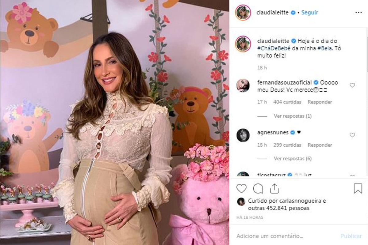Ela apareceu com uma máscara de dormir, como se fosse uma venda. Claudia também postou uma foto no feed e celebrou o dia. “Hoje é o dia do #CháDeBebê da minha #Bela. Tô muito feliz!”, escreveu. Os amigos famosos e seguidores aproveitaram para elogiar a cantora. “O meu Deus! Você merece!”, disse Fernanda Souza. “Coisa linda vocês duas viu”, comentou outra seguidora.