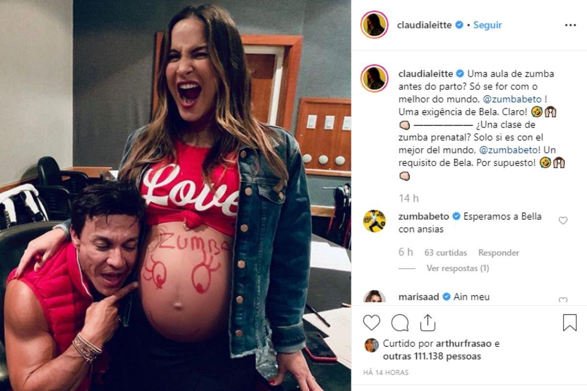 A cantora fui visitar um amigo especialista em zumba e publicou uma foto ao lado dele, mostrando o tamanho da barriga e também que tudo aquilo tinha sido exigência da própria Bela. “Uma aula de zumba antes do parto? Só se for com o melhor do mundo, @zumbabeto ! Uma exigência de Bela. Claro!”, escreveu.