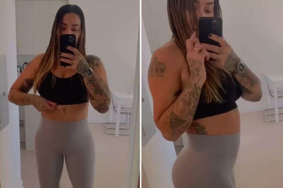 “A pessoa só consegue usar roupa de academia. Tudo me aperta, tudo me machuca, tudo me incomoda”, começou ela, nos stories do Instagram. “Temos aqui uma barriga de quatro meses, quase entrando no quinto mês, semana que vem eu entre no quinto mês. É isso, gente, aqui estamos na saga da roupa. Só consigo usar legging, shorts, camisetão, não consigo usar nada que me aperte muito”.