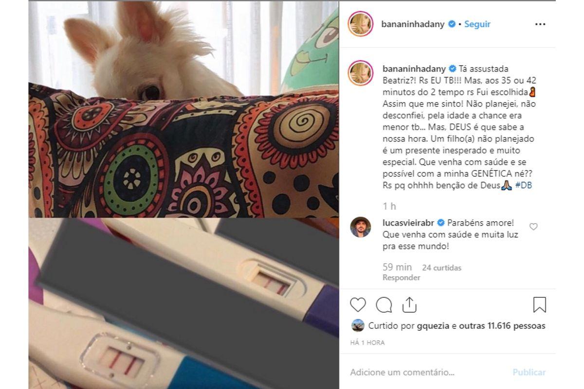 Por mais que o anúncio da gestação tenha sido vazado pela jornalista do O Dia, Fábia Oliveira, não demorou muito tempo para que Bananinha usasse as redes sociais para confirmar a notícia e brincar com a situação.