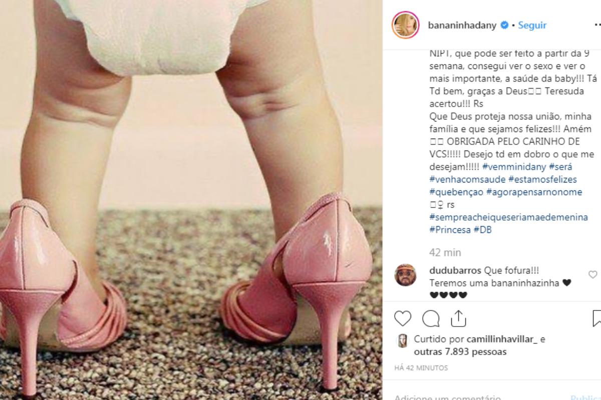 A futura mãe usou uma imagem da internet onde há uma menina com fraldas e sapato alto cor de rosa. “É menina! rs”, escreveu na legenda.