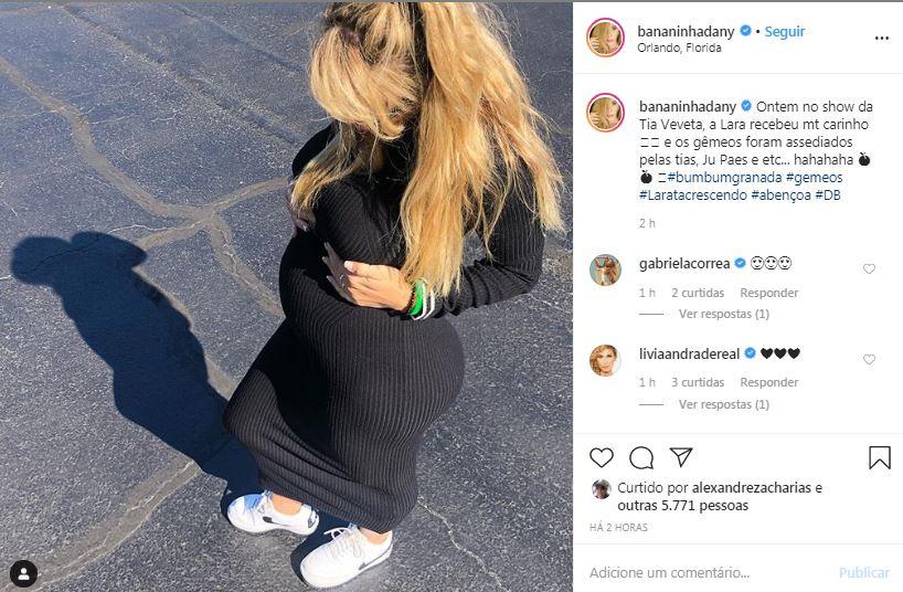Na segunda-feira, 20 de janeiro, Dany publicou outra foto durante o show de Ivete e mostrou como a barriga já cresceu. “Ontem no show da Tia Veveta, a Lara recebeu muito carinho. E os gêmeos foram assediados pela tia Ju Paes #bumbumgranada #Laratacrescendo”, brincou a assistente na legenda da publicação, referindo-se às mudanças de seu corpo na gestação.