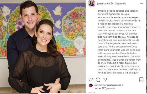 Na manhã desta terça-feira, 28 de janeiro, a deputada estadual Janaina Riva (MDB) agradeceu pelas parabenizações que recebeu no aniversário e revelou uma noticia bem triste. Um dos bebês que ela esperava não sobreviveu à gestação.