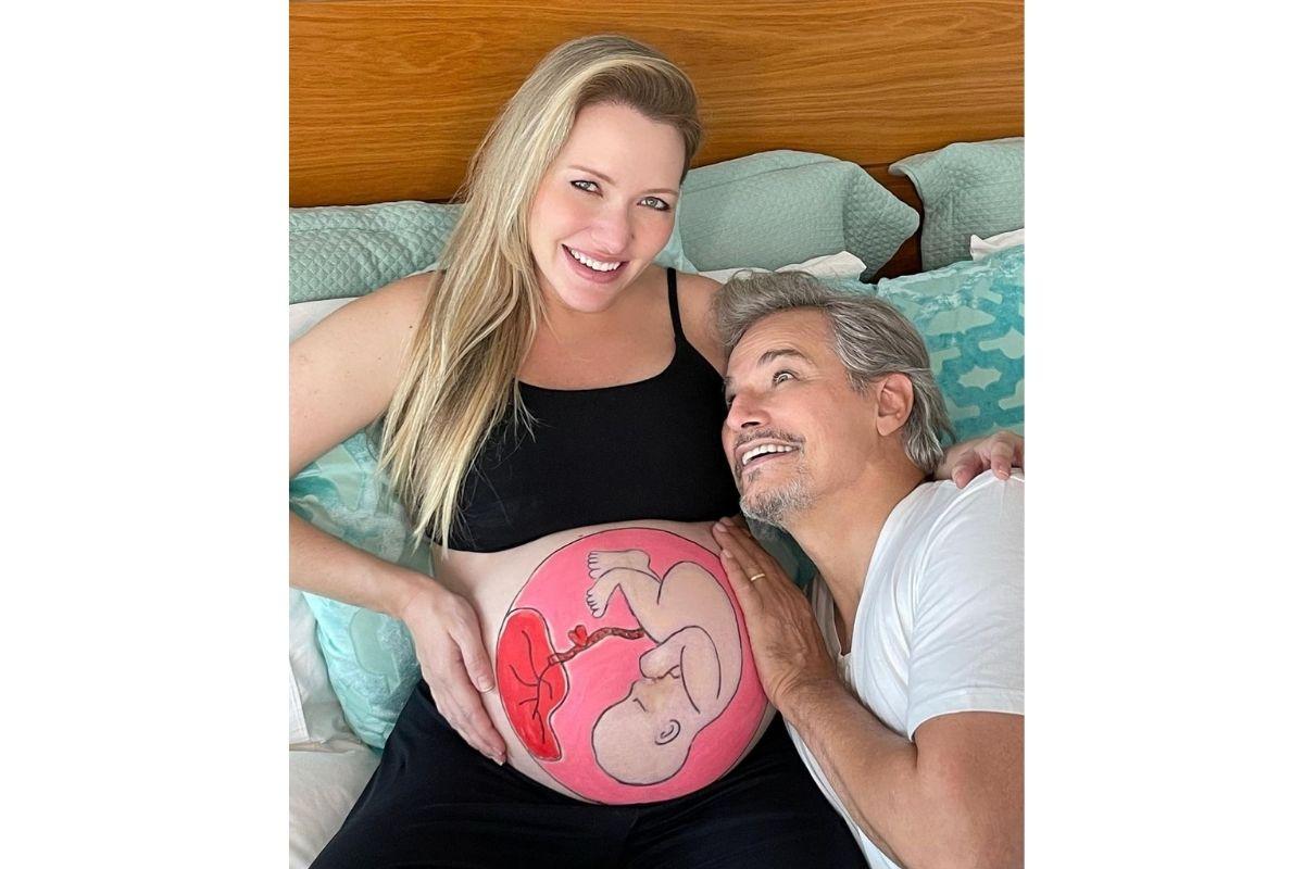 Bebê a caminho! Esperando a primeira filha ao lado da atual esposa, Karin Roepke, o ator Edson Celulari registrou a arte feita na barriga grávida da parceira nesta terça-feira, 04.