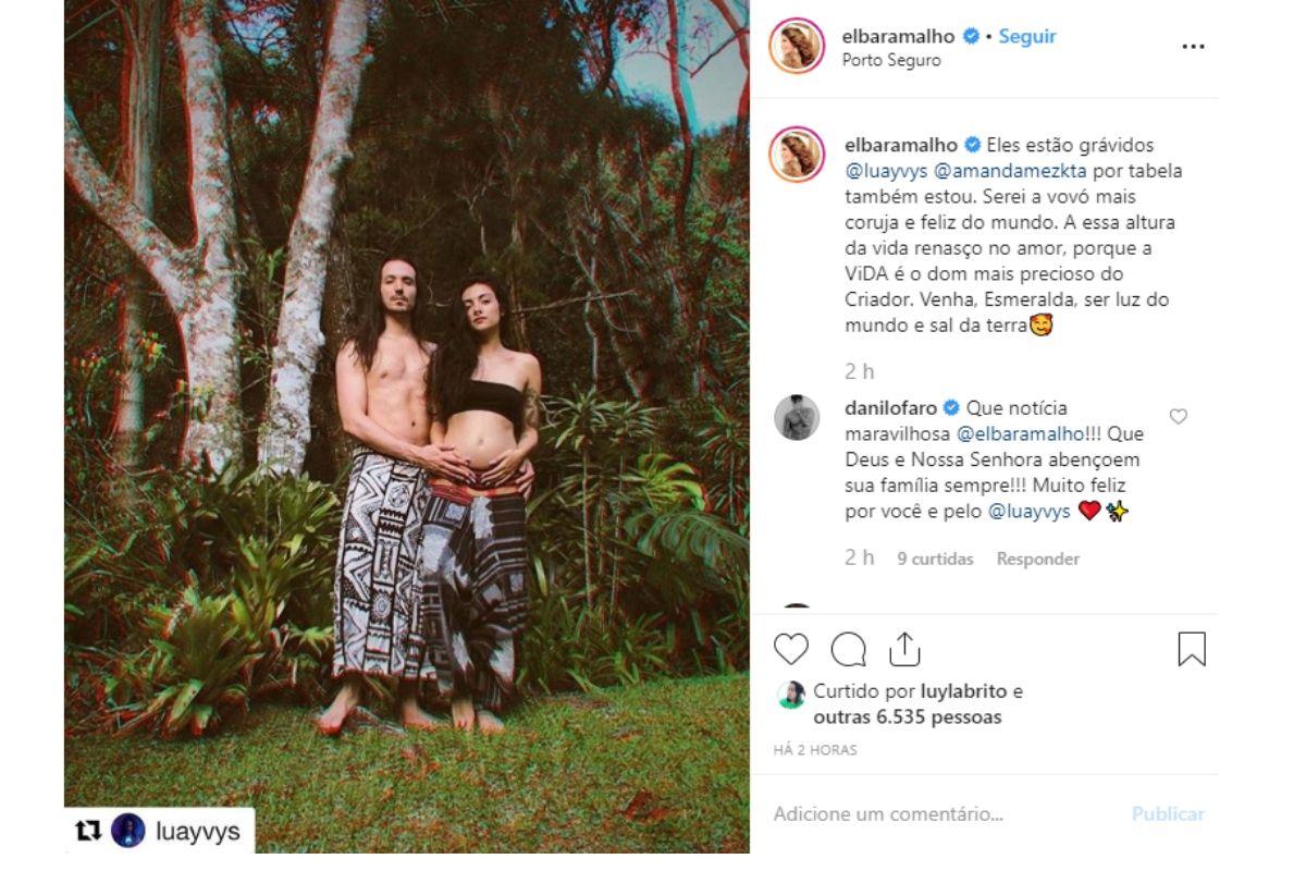 “Eles estão grávidos @luayvys @amandamezkta por tabela também estou. Serei a vovó mais coruja e feliz do mundo. A essa altura da vida renasço no amor, porque a Vida é o dom mais precioso do Criador. Venha, Esmeralda, ser luz do mundo e sal da terra”, escreveu ela.