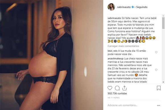 “Só falta nascer. Tem uma bebê de 50 cm aqui dentro. Mas agora é só esperar. Todo mundo tá falando pra mim que tem que esperar a mudança da Lua. Como funciona essa história? Alguém me explica, por favor? Nascem mais bebês nesses dias? Me ajudem”, escreveu na legenda da foto, que recebeu mais de 500 mil curtidas.