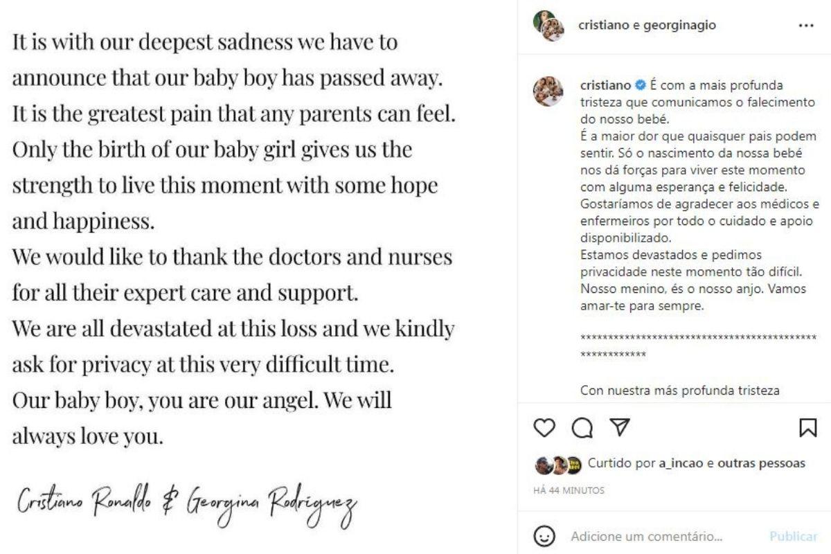 “É com a mais profunda tristeza que comunicamos o falecimento do nosso bebé. É a maior dor que quaisquer pais podem sentir. Só o nascimento da nossa bebé nos dá forças para viver este momento com alguma esperança e felicidade. Gostaríamos de agradecer aos médicos e enfermeiros por todo o cuidado e apoio disponibilizado. Estamos devastados e pedimos privacidade neste momento tão difícil. Nosso menino, és o nosso anjo. Vamos amar-te para sempre.”, escreveu Cristiano na publicação.