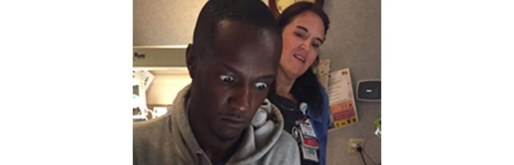 Quando Tiarra Kemp estava em trabalho de parto, seu parceiro Steven Mason era um participante ativo em todo o processo. Quando chegou a hora dela empurrar, Steven agarrou uma perna para ajudar a sustentá-la. Ele também conseguiu um lugar na primeira fila para a ação e, milagrosamente, alguém tirou uma foto de sua expressão no momento em que viu a cabeça do bebê aparecer.