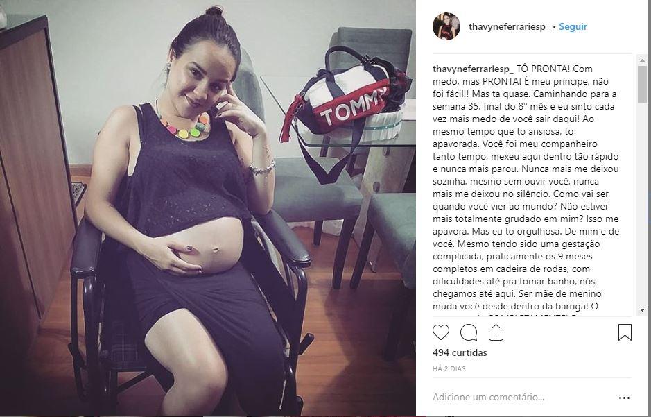 Desde o primeiro mês de gestação, Thávyne enfrenta uma gravidez de risco, pois sente dores muito fortes no quadril, que não permitem que ela fique em pé por mais de 15 minutos seguidos. Recentemente, ela compartilhou uma foto sentada em uma cadeira de rodas que tem usado para se locomover por conta dessas dores.