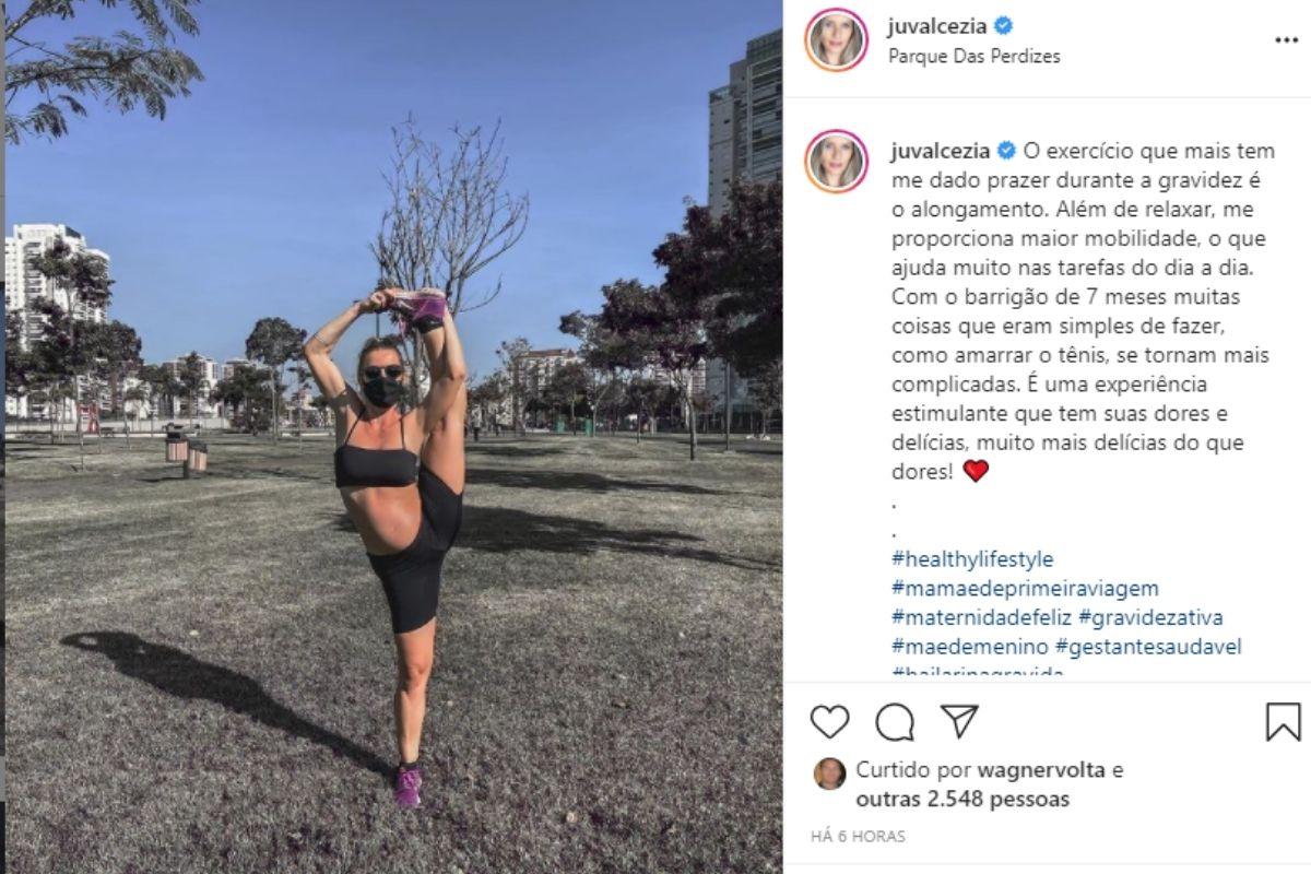 Juliana Valcézia, ex-bailarina do Faustão, está grávida de 7 meses e tem usado as redes sociais para atualizar os seguidores sobre a gestação e também mostrar um pouco da rotina de exercícios nesta fase. Nesta quinta-feira, 27 de maio, ela usou o Instagram para compartilhar um alongamento que fez no Parque Jardim das Perdizes, em São Paulo. A foto chamou a atenção dos internautas.