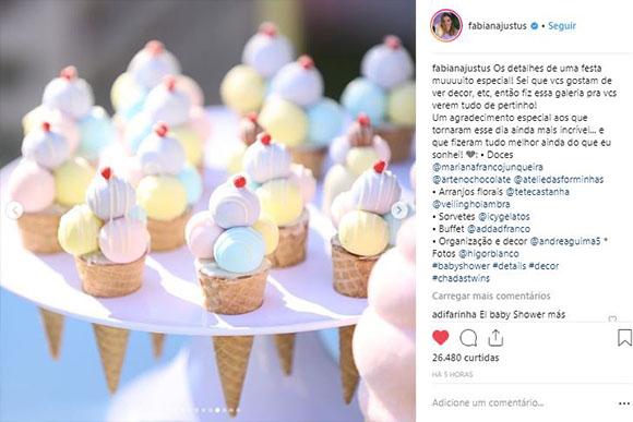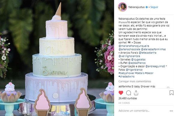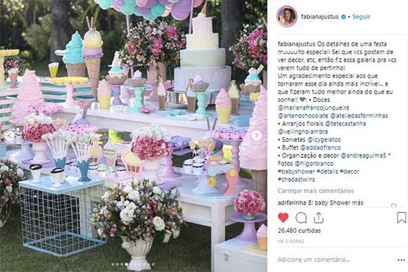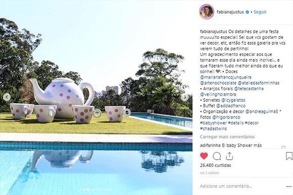 A influenciadora digital Fabiana Justus, de 32 anos, realizou seu chá de bebê ao ar livre com direito a uma decoração deliciosa! Ela está esperando as gêmeas Chiara e Sienna, depois ter passado por uma fertilização in vitro. Ela chegou a sofrer um aborto por ter ovários policístico. Ela vai completar 2 anos de casada esse ano com o empresário Bruno D’Ancona.