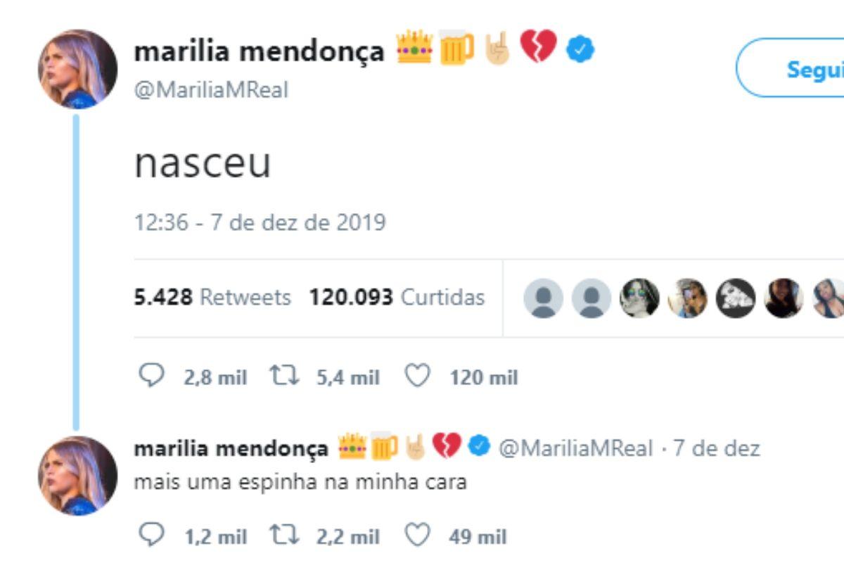 No sábado, 7 de dezembro, Marília Mendonça deu um baita susto nos seguidores depois de publicar um tweet suspeito. A cantora, que está grávida de nove meses do primeiro filho com Murilo Huff, escreveu “nasceu” e deixou no ar o que teria acontecido depois.