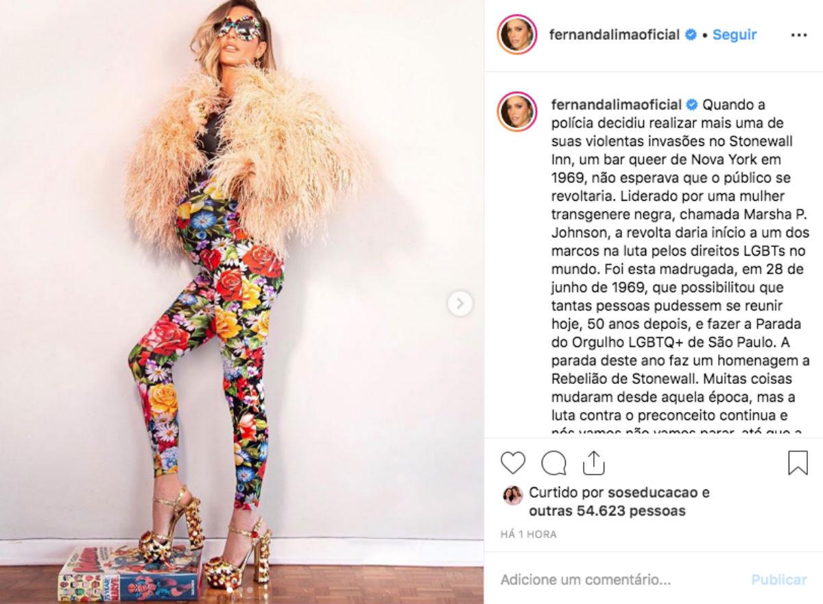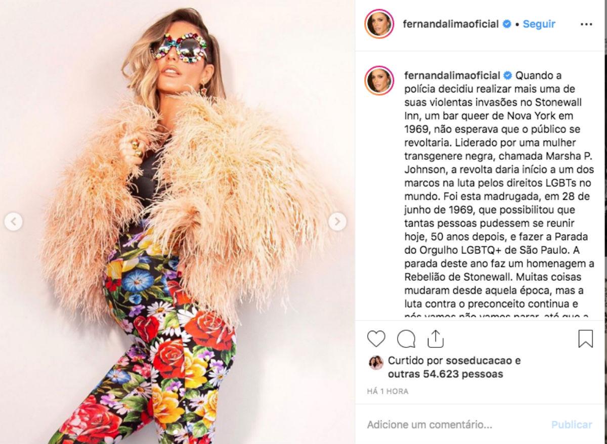 Neste domingo, 23 de junho, data em que acontece a Parada do Orgulho gay na Avenida Paulista, em São Paulo, a apresentadora fez uma homenagem ao movimento LGBTQ+ com uma foto mostrando o barrigão e uma legenda poderosa: