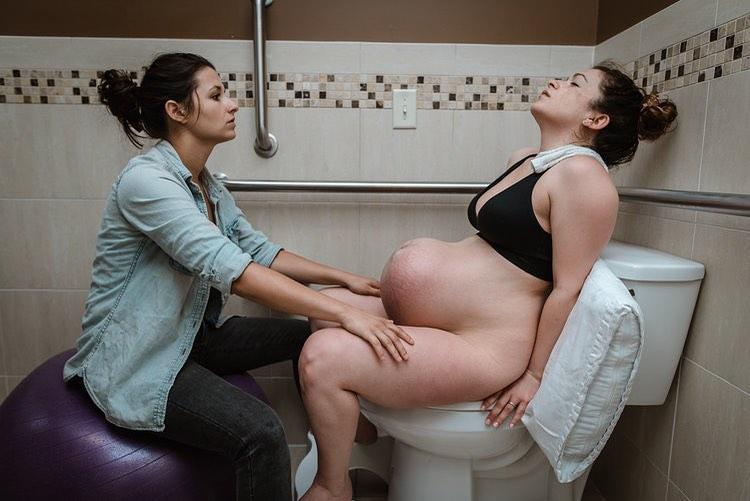 Na imagem, em que a mulher está acompanhada de uma doula, é possível ver a quantidade de tensão na região da barriga dela, que também está bem baixa. Ela está sentada na privada, apoiada em um travesseiro.