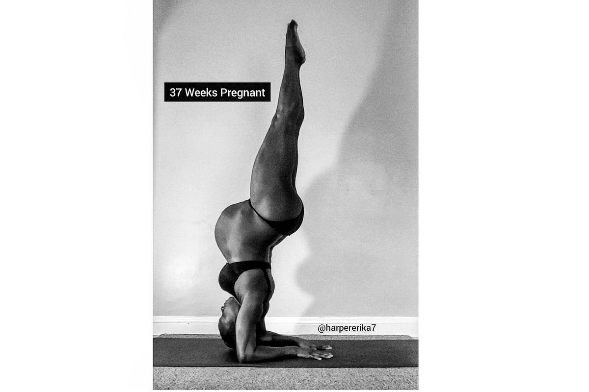 A professora de yoga norte-americana Erika Harper vem impressionando as redes sociais. Mãe de duas crianças, Anïs e Azari, ela registrou algumas posturas que fez enquanto estava grávida do segundo filho. Em uma das imagens, ela está com 37 semanas de gestação e faz uma postura invertida sobre a cabeça.