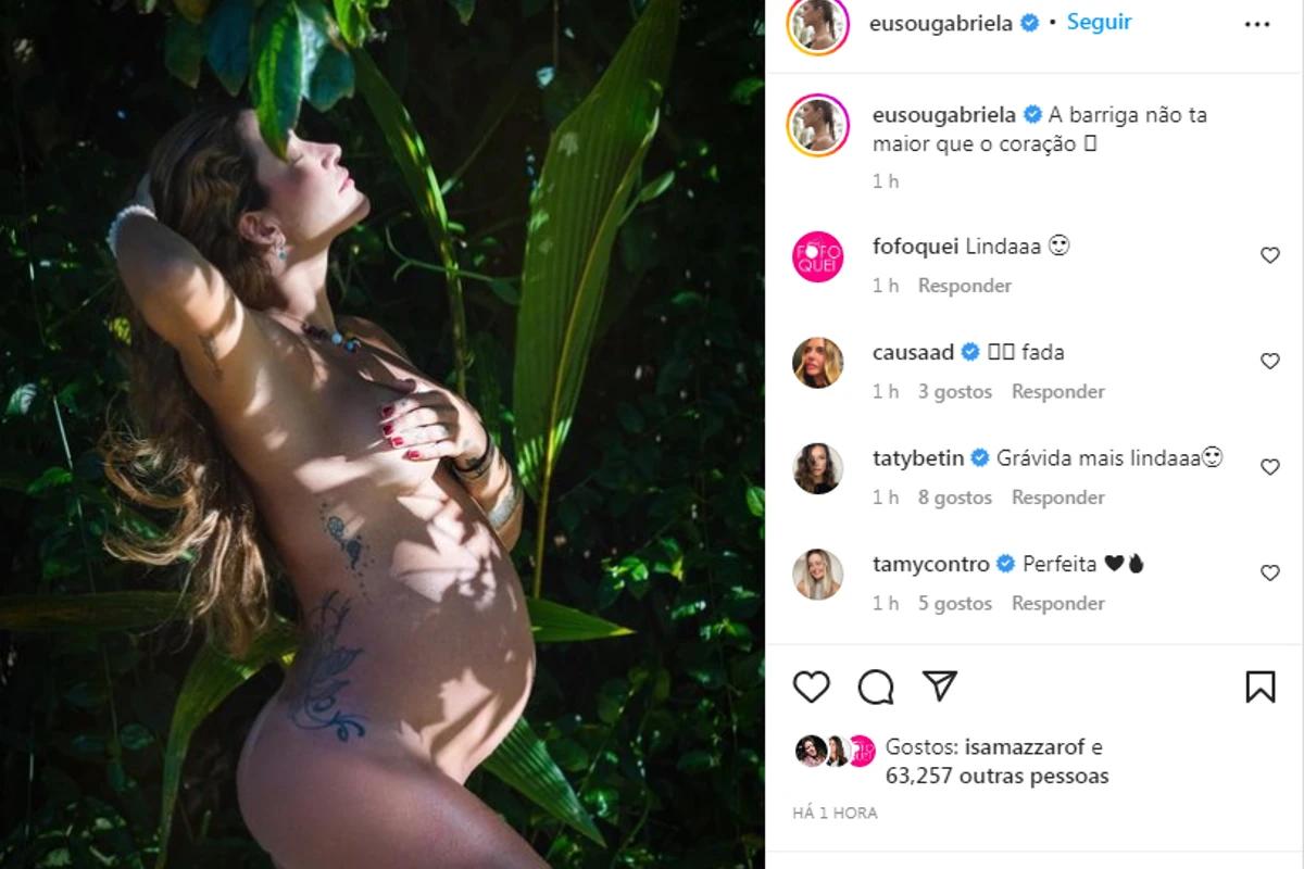 “A barriga não tá maior que o coração”, escreveu Gabriela na legenda da publicação. Logo após, a mãe de primeira viagem compartilhou a foto, os fãs e seguidores encheram os comentários com elogios a ela. Maravilhosa”, disse uma seguidora. “Perfeita”, escreveu outra. “A grávida mais linda”, comentou uma internauta. “Que foto incrível. Parabéns”, falou mais uma. “Linda e plena”, afirmou uma fã.