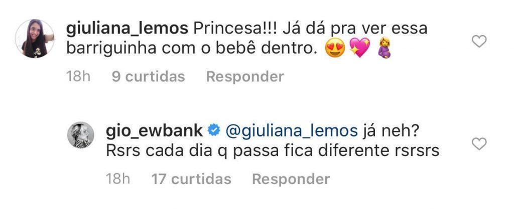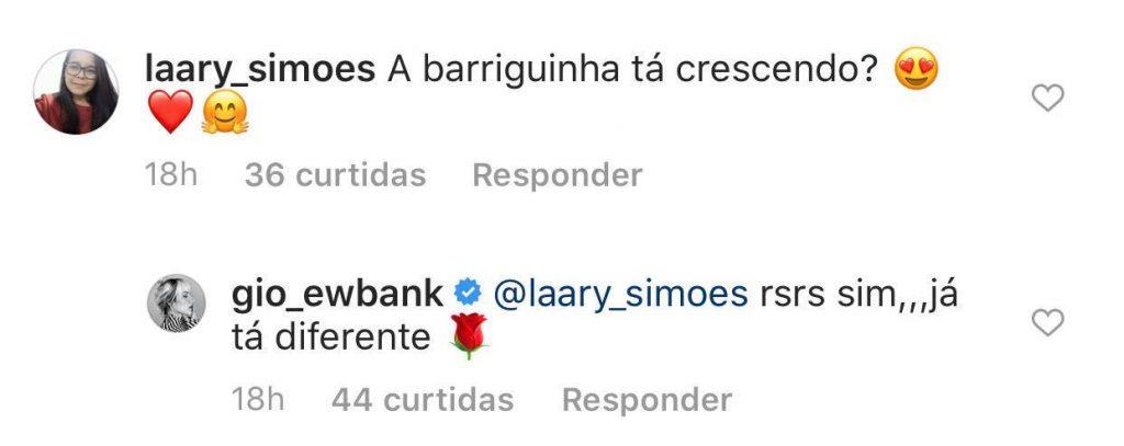 “A barriguinha está crescendo?”, perguntou uma e Gio respondeu: “Sim, já está diferente!”. “Já dá pra ver essa barriguinha com o bebê dentro!”, outra escreveu e ela comentou: “Já, né? Cada dia que passa fica diferente!”.