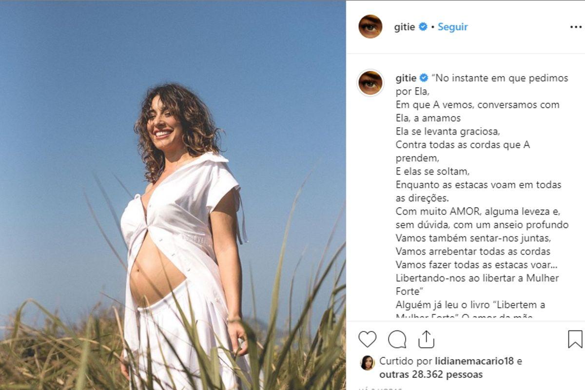 A atriz aparece em um campo e sorrindo deixa a barriga a mostra, na legenda ela abriu o coração e falou sobre amor, desejos, literatura e sobre como imagina o futuro ao lado da filha. “No instante em que pedimos por ela, em que a vemos, conversamos com ela, a amamos. Ela se levanta graciosa, contra todas as cordas que a prendem e elas se soltam, enquanto as estacas voam em todas as direções. Com muito AMOR, alguma leveza e, sem dúvida, com um anseio profundo. Vamos também sentar-nos juntas vamos arrebentar todas as cordas, vamos fazer todas as estacas voar… Libertando-nos ao libertar a Mulher Forte”, escreveu.