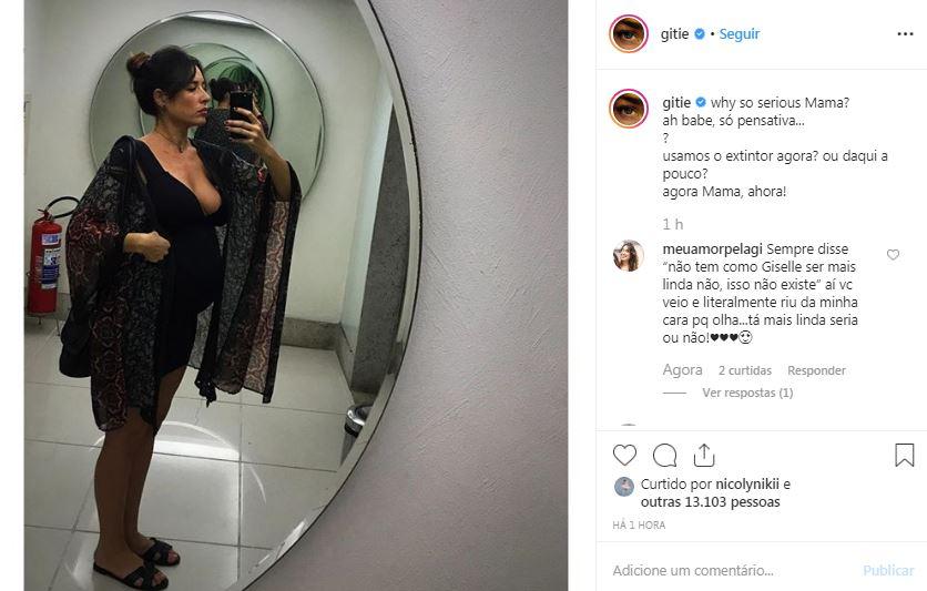 “Why so serious, Mama? Ah babe, só pensativa. Usamos o extintor agora ou daqui a pouco? Agora, Mama, agora!”, brincou Giselle na legenda da publicação. Giselle Itié está esperando seu primeiro filho, fruto de seu relacionamento com Guilherme Winter, a atriz está no 6º mês da gestação.