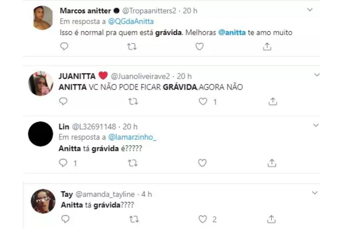 Os fãs da cantora não deixaram o assunto de lado e pelo Twitter, começaram a tentar “provar” de que Anitta estaria esperando um bebê. Os internautas até selecionaram alguns vídeos para mostrar que tinham razão. No show, a cantora teve uma queda de pressão enquanto estava no palco.