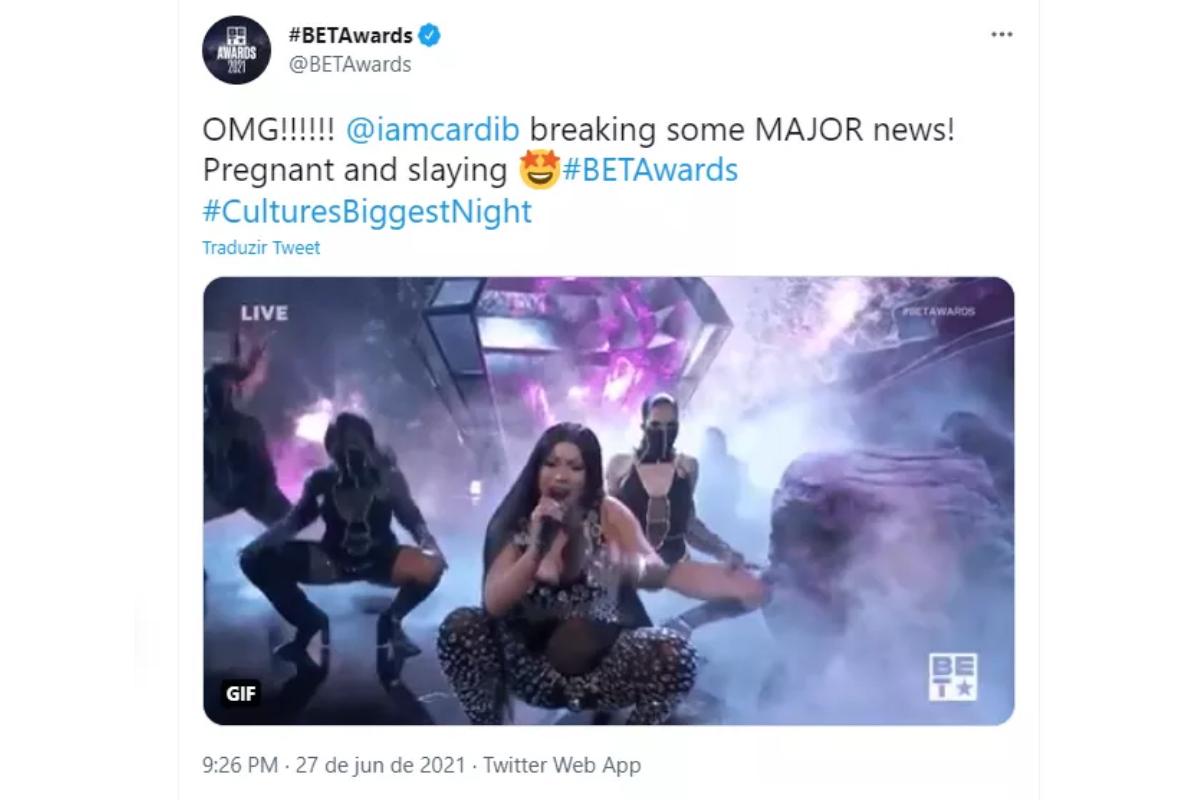 No Twitter, a conta oficial da premiação comemorou a novidade da cantora, e declarou, “Grávida e arrebentando!”. Cardi B revelou a gravidez em uma roupa especial que usou durante a performance com o grupo musical Migos – em que deixava em evidência a barriga.