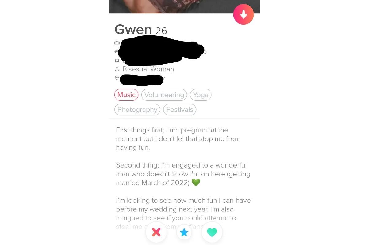 Um usuário printou o perfil da mulher, que se identifica como Gwen, de 26 anos. Na biografia, ela explica mais sobre quem é. “Antes de tudo, eu estou grávida no momento, mas isso não me impede de me divertir”, começou.