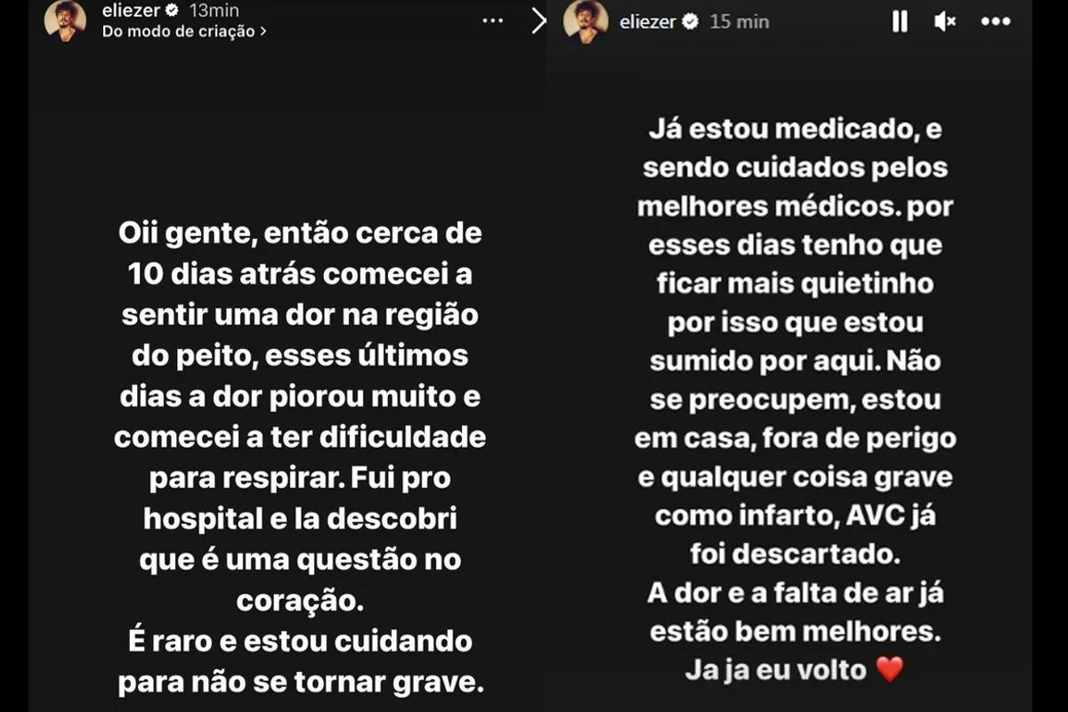 Nesse domingo, dia 13 de novembro, o ex-BBB Eliezer veio nas redes sociais contar aos seguidores que foi diagnosticado com um problema raro no coração após dais sentindo dores estranhas. A namorada dele, a influenciadora e também ex-BBB Viih Tube, se pronunciou em seus stories do Instagram e deixou um alerta para os internautas sobre o assunto.