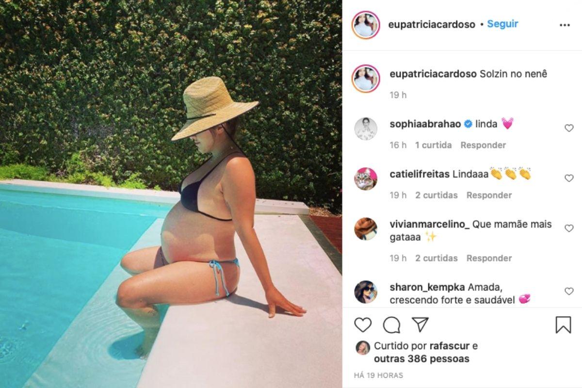 No último domingo, 15 de novembro, Patrícia Cardoso, na reta final da gestação, esperando Alice, fruto da relação com Marcelo Adnet, postou imagem sentada na beira da piscina com chapéu e biquíni exibindo a barriga de 9 meses de gestação. Ela, segundo a Caras, estava aproveitando o domingo de sol.