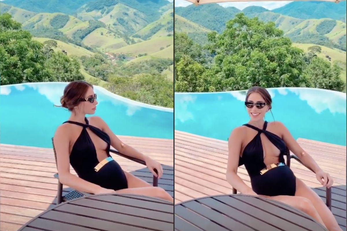 Romana aparece com o cabelo preso, óculos de sol estiloso e maiô preto cheio de recortes e com um pouco de dourado, evidenciando a barriga da famosa. Ao fundo dos Stories está tocando a música de Alok com Ilkay Sencan chamada ‘Don’t Say GoodBye’.