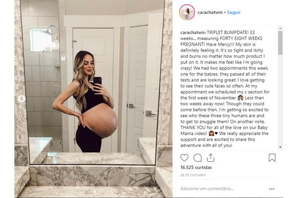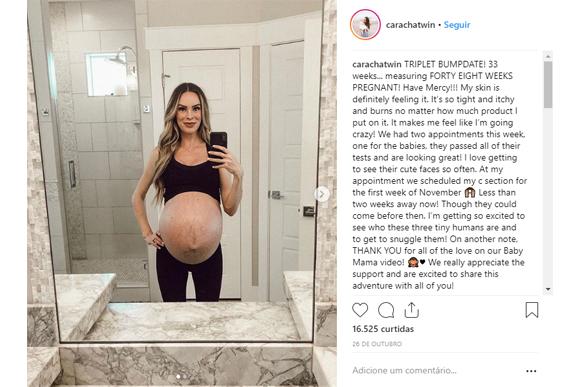 Com 34 semanas de gestação, Cara publicou uma foto nesta segunda (5) exibindo o barrigão e contando que marcou a cesárea para esta semana. A blogueira espera duas meninas e um menino. “Eu realmente estou esperando que quando os bebês nascerem, eles estejam com 5 libras ou mais, algo que eu nunca esperei ser uma possibilidade! Estamos muito ansiosos e empolgados”, escreveu na legenda do post.