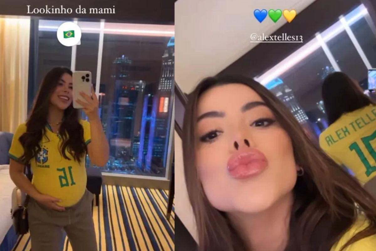 Nesta quinta-feira, dia 24 de novembro, no dia da estreia do Brasil na Copa do Mundo 2022, a esposa do jogador Alex Telles, Vitoria apareceu arrumado no Instagram para assistir o jogo no Catar.A influenciadora e compositora que está grávida de oito meses compartilhou uma foto em frente ao espelho e uma selfie usando o uniforme da Seleção Brasileira.