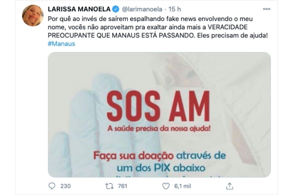 Os boatos começarem depois que algumas pessoas notaram que a artista estava com uma “barriga acentuada” e começaram a suspeitar de uma possível gestação. “Por que ao invés de saírem espalhando fake news envolvendo o meu nome, vocês não aproveitam para exaltar ainda mais a veracidade preocupante que Manaus está passando. Eles precisam de ajuda”, escreveu ela.