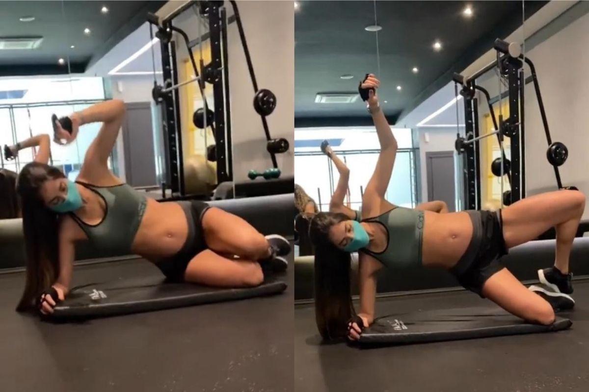 Com visual ‘fitness’, que deixava a barriga de 6 meses a mostra ela apareceu colocando toda força em jogo, abrindo e fechando as pernas em uma ‘prancha lateral’. O treino foi comandado pela treinadora de Romana, Juliana Lima, no que parece ser a academia do prédio em São Paulo onde mora com a família.
