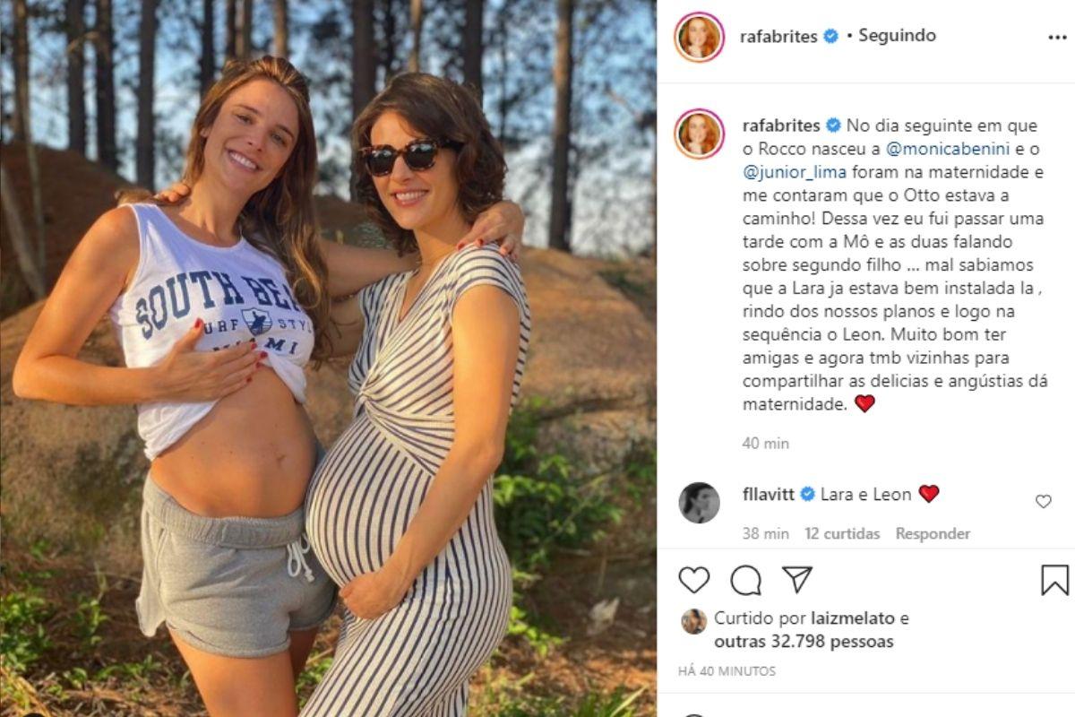 “No dia seguinte em que o Rocco nasceu a @monicabenini e o @junior_lima foram na maternidade e me contaram que o Otto estava a caminho! Dessa vez eu fui passar uma tarde com a Mô e as duas falando sobre segundo filho … mal sabiamos que a Lara já estava bem instalada lá , rindo dos nossos planos e logo na sequência o Leon. Muito bom ter amigas e agora também vizinhas para compartilhar as delicias e angústias dá maternidade”, escreveu ela, ao publicar uma foto em que as duas aparecem com as mãos sobre as barrigas.
