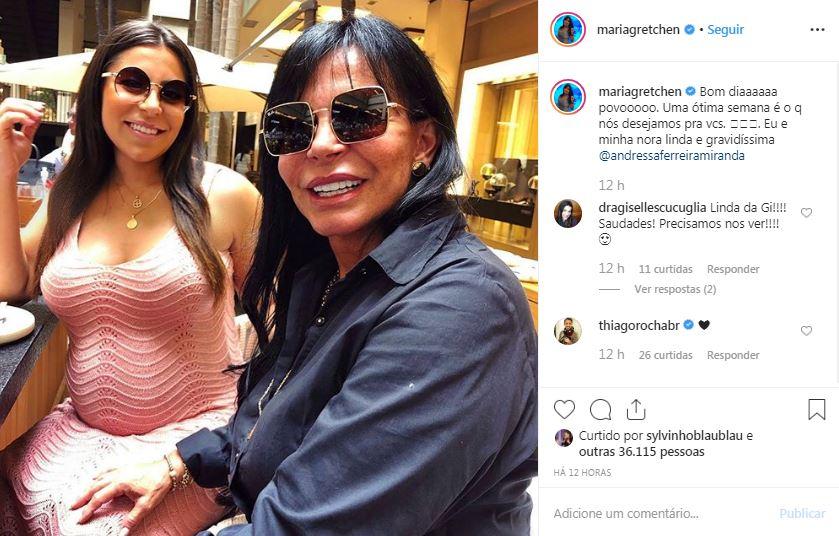 “Bom dia, povo! Uma ótima semana é o que nós desejamos para vocês. Eu e minha nora linda e gravidíssima, Andressa Ferreira Miranda“, escreveu Gretchen na legenda da publicação. Andressa Ferreira está na reta final da primeira gestação, a coach está esperando seu primeiro filho fruto de seu relacionamento com Thammy Miranda.
