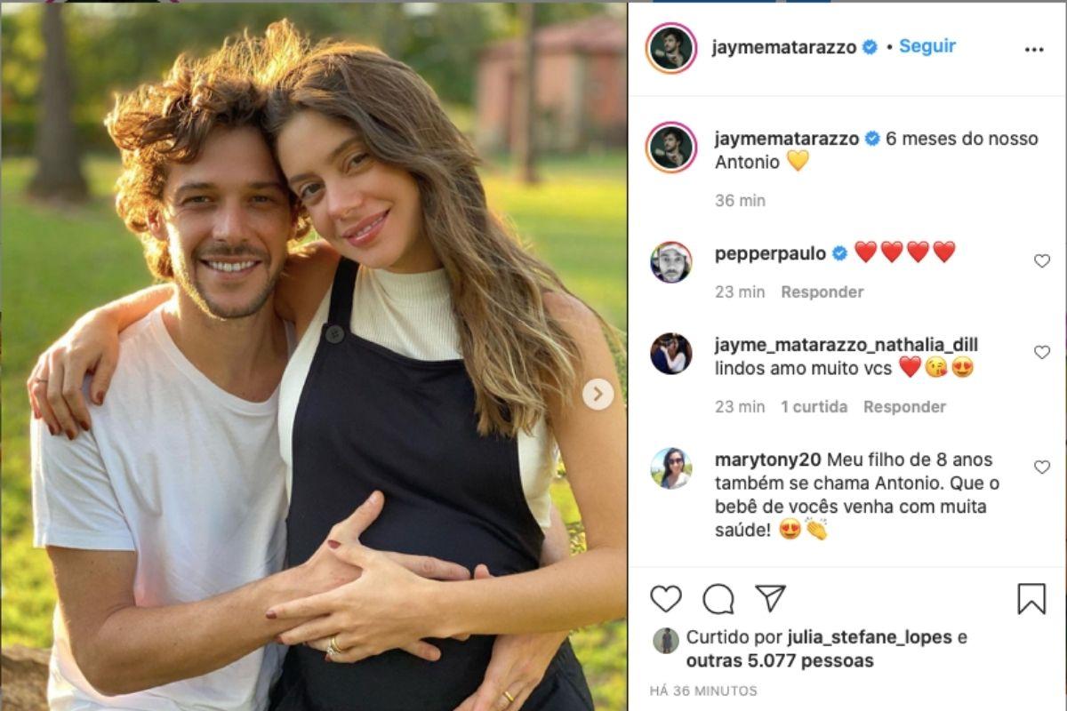 O casal apareceu em cliques fazendo carinho na barriga da publicitária em meio a natureza em um novo post do ator em suas redes sociais com a legenda “6 meses do nosso Antonio”. Os seguidores se encantaram com os cliques e encheram a publicação de comentários amorosos.