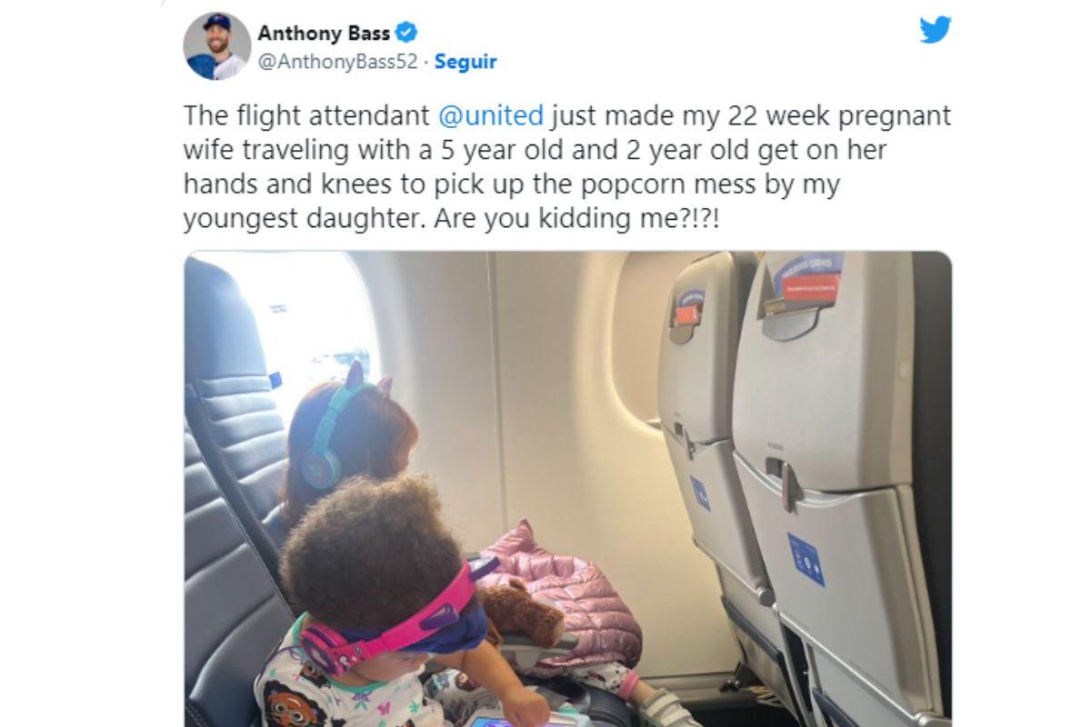 Na postagem realizada no último domingo, dia 16 de abril, ele contou que a companhia aérea ofereceu lanches para todos os passageiros. Logo a filha de Bass, de 2 anos, escolheu comer pipoca e acabou deixando cair algumas perto do assento. De acordo com o atleta, uma comissária de bordo teria pedido para a mulher grávida de 22 semanas se ajoelhar para pegar a comida que estava no chão.