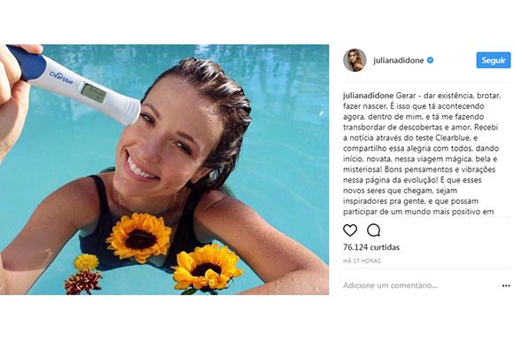 Aos 33 anos, Juliana Didone anuncia a gravidez de seu primeiro filho com o artista plástico Flávio Rossi na quarta, 18, no Instagram. Na foto, a atriz aparece segurando o teste positivo com a legenda: