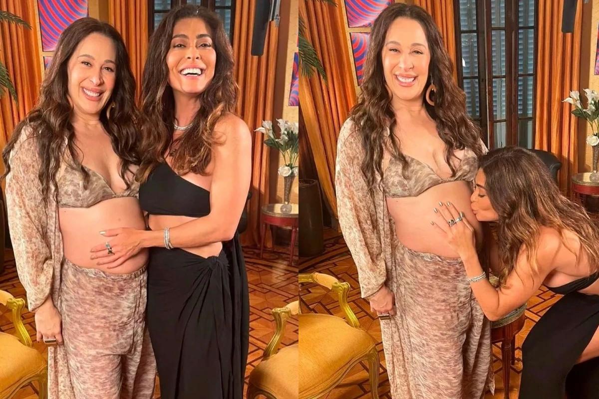 Na primeira imagem, as artistas posam lado a lado, enquanto Juliana Paes deixa a mão na barrida da amiga. Já na segunda foto, ela dá um beijo na barriga de grávida da Claudia Raia.