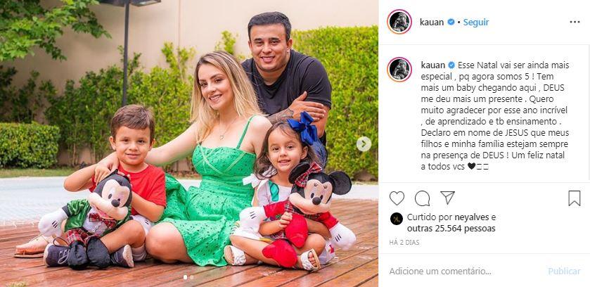 “Esse Natal vai ser ainda mais especial, porque agora somos 5! Tem mais um baby chegando aqui. Deus me deu mais um presente. Quero muito agradecer por esse ano incrível de aprendizado e também ensinamento. Declaro em nome de Jesus que meus filhos e minha família estejam sempre na presença de Deus! Um feliz natal a todos vocês”, declarou o cantor sertanejo na legenda da publicação.