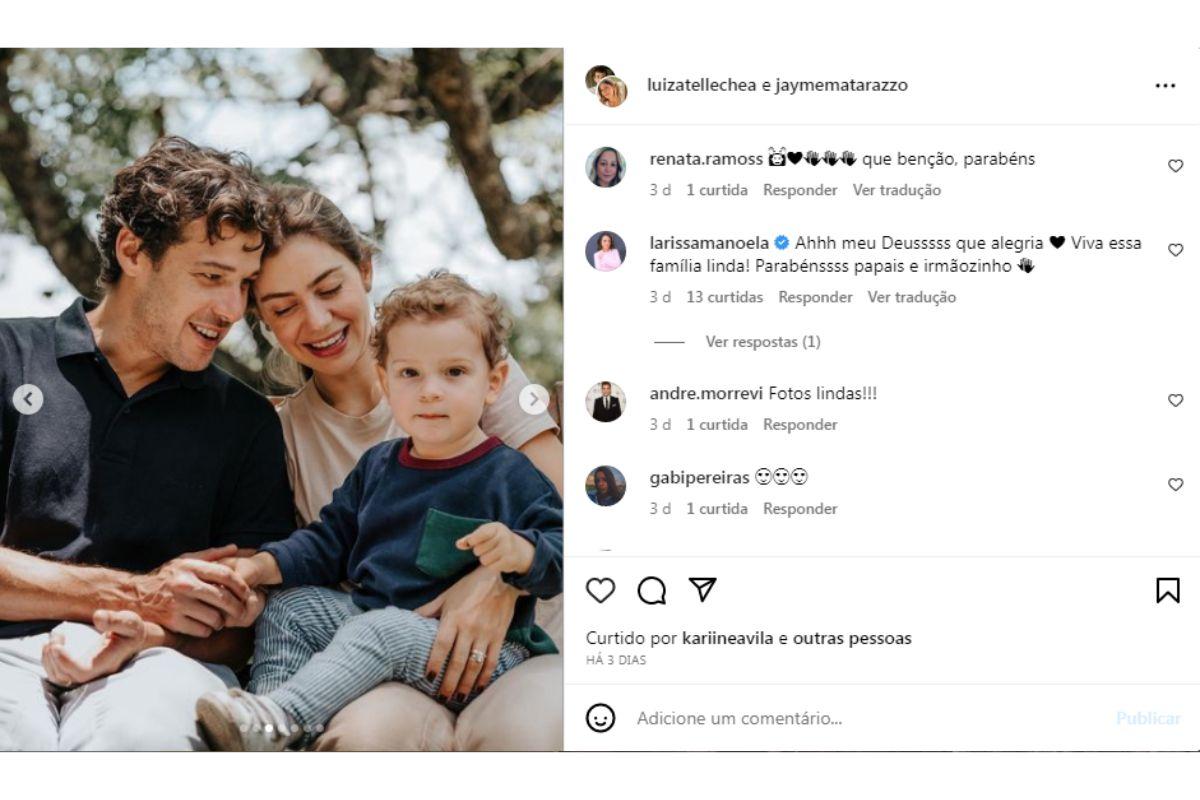 “Ah meu Deus que alegria. Viva essa família linda! Parabéns papais e irmãozinho”, escreveu a atriz nos comentários da publicação feita por meio do Instagram. Jayme e Luiza já são pais de Antônio, e estão à espera de uma menina, que se chamará Maria. Larissa está noiva do também ator André Luiz Frambach.