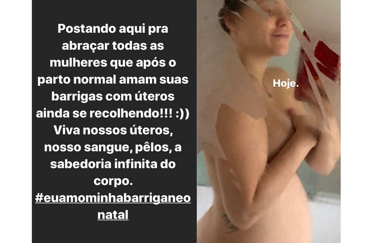 “Postando aqui pra abraçar todas as mulheres que após o parto normal amam suas barrigas com úteros ainda se recolhendo!!! Viva nossos úteros, nosso sangue, pêlos, a sabedoria infinita do corpo”, escreveu em legenda.