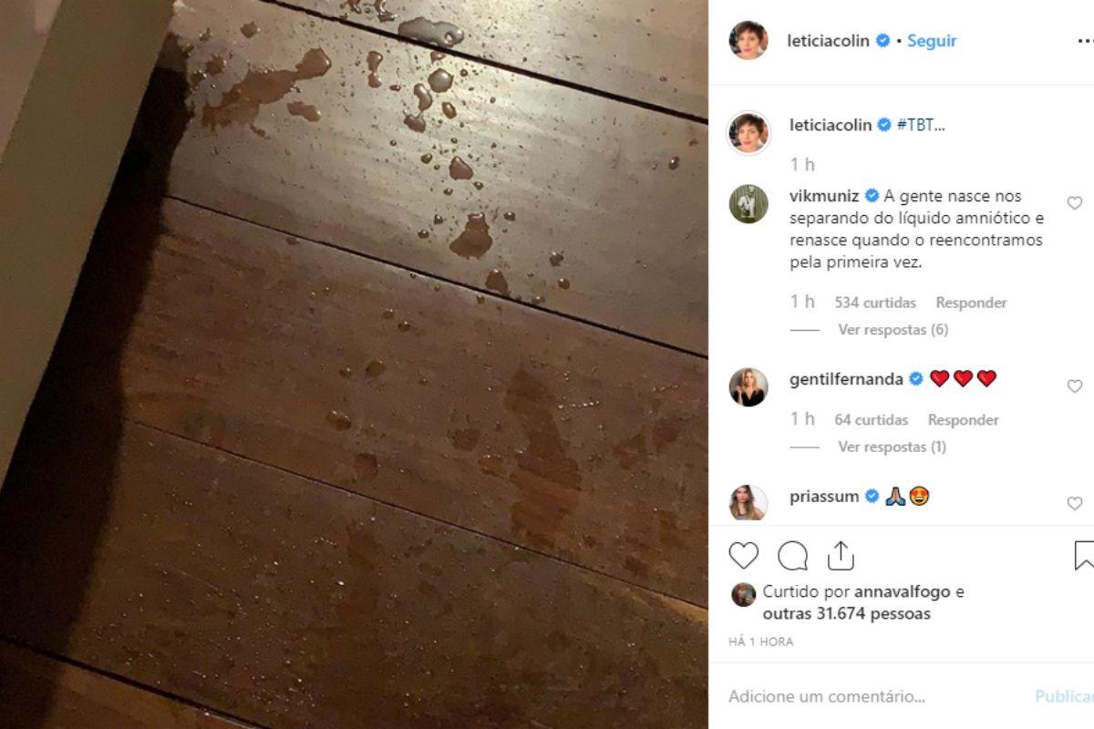 A atriz passou por um parto normal na última quinta-feira, 14 de novembro, e para comemorar a primeira semana do nascimento do filho, ela publicou uma foto da bolsa se rompendo. Leticia postou uma foto do chão todo sujo de líquido aminótico e apenas escreveu: “TBT”.