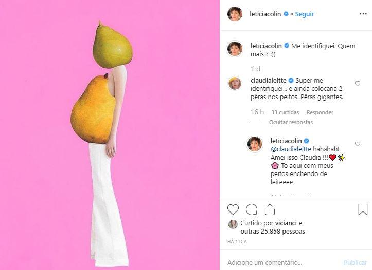 A atriz também compartilhou uma foto que fez os seguidores refletirem. No domingo, 3 de novembro, Letícia postou em seu Instagram uma foto de uma mulher grávida com uma pera verde na cabeça e uma pera madura no corpo. “Me identifiquei. Quem mais?”, disse a atriz na legenda da publicação.