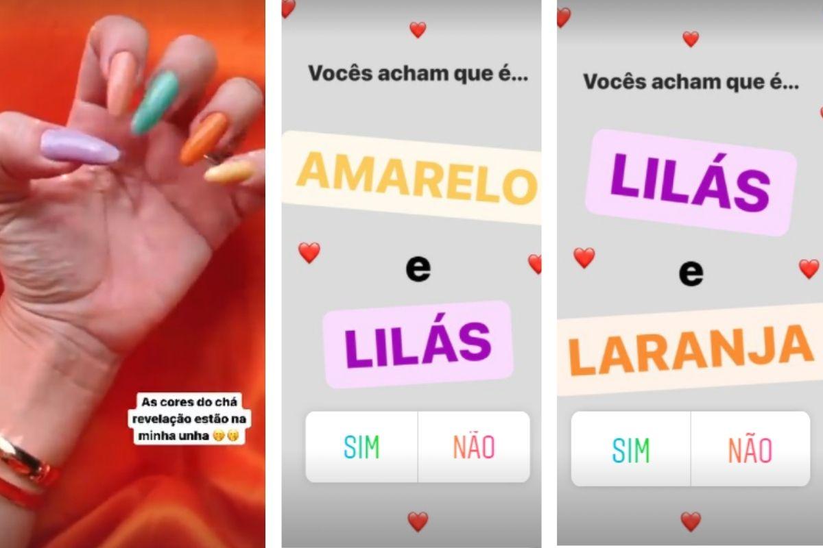 Logo em seguida, pediu para os internautas votarem para tentarem adivinhar quais serão as cores escolhidas pelo casal. Para isso, ela fez uma série de combinações de cores seguindo os esmalte dela: amarelo e lilás; lilás e laranja; dourado e verde; lilás e dourado; laranja e amarelo ou verde e laranja. Seja qual for a cor, a realidade é que os fãs do casal já estão no aguardo para ver a decoração da festa e descobrir se os dois estão à espera de um menino ou uma menina!