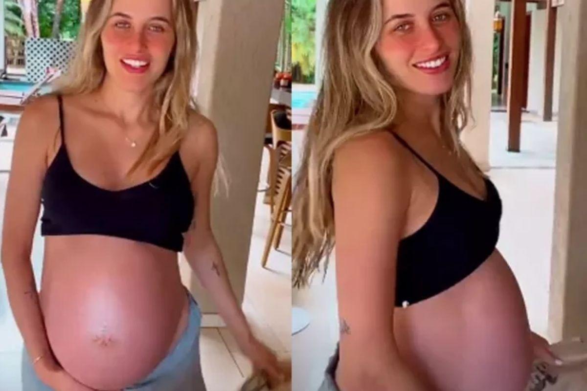 Usando apenas um top e um shorts, a modelo até sambou enquanto Lucas filmava a cena para os seguidores. “Deixar eu mostrar como está o barrigão. O barrigão vai explodir, gente. Olha só, está até vermelho! O meninão está vindo, hein?!”, brincou o sertanejo. O bebê é um menino e deve se chamar Luca.