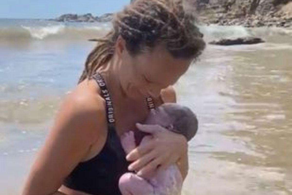 Mãe divide opiniões após realizar parto humanizado na praia: “Não é nojento”